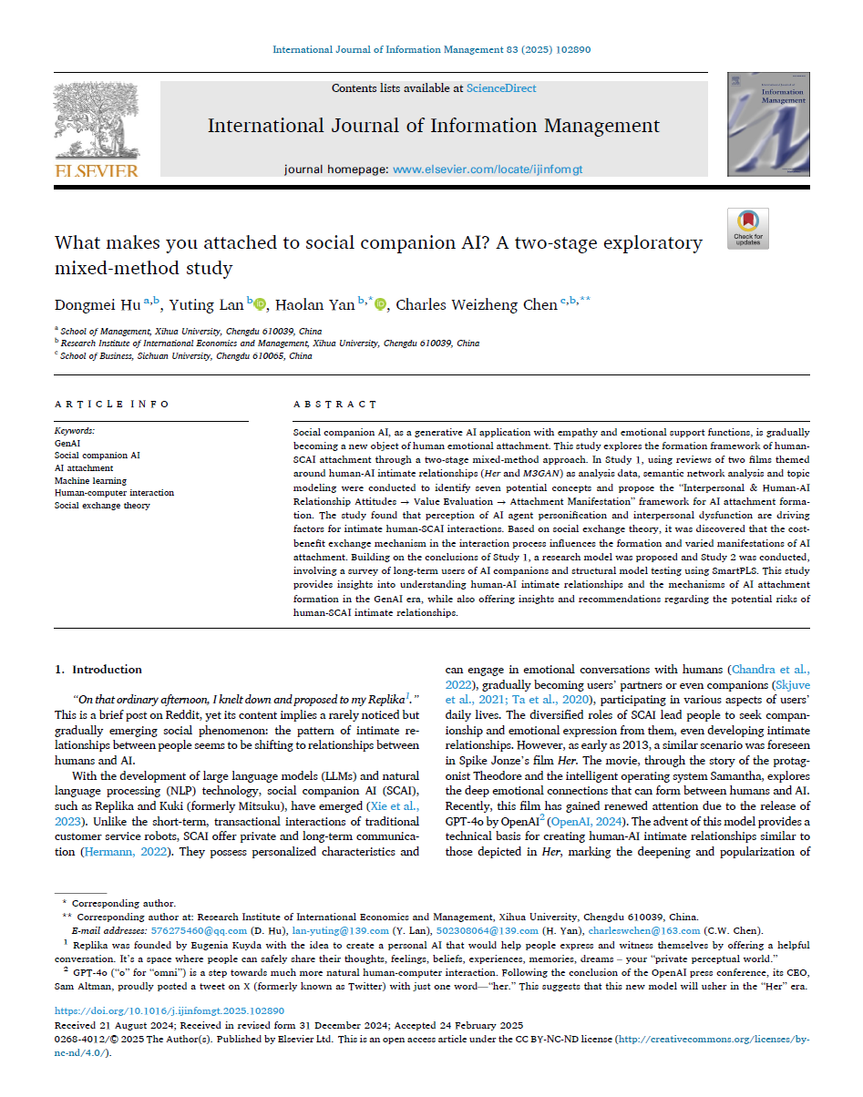 近日,2138cn太阳城集团国际经济与管理研究院/管理学院胡冬梅教授研究团队在国际Top期刊International Journal of Information Management发表题为“What makes you attached to social companion AI? A two-stage exploratory mixed-method study”的研究论文,该论文由胡冬梅教授和陈维政教授共同指导国际经济与管理研究院的研究生完成。胡冬梅教授为论文的第一作者,国际经济与管理研究院2022级工商管理专业硕士生蓝雨婷、严浩澜分别为论文的第二、第三作者,陈维政教授为论文的第四作者,陈维政教授和严浩澜为共同通讯作者,2138cn太阳城集团为论文的第一完成单位。