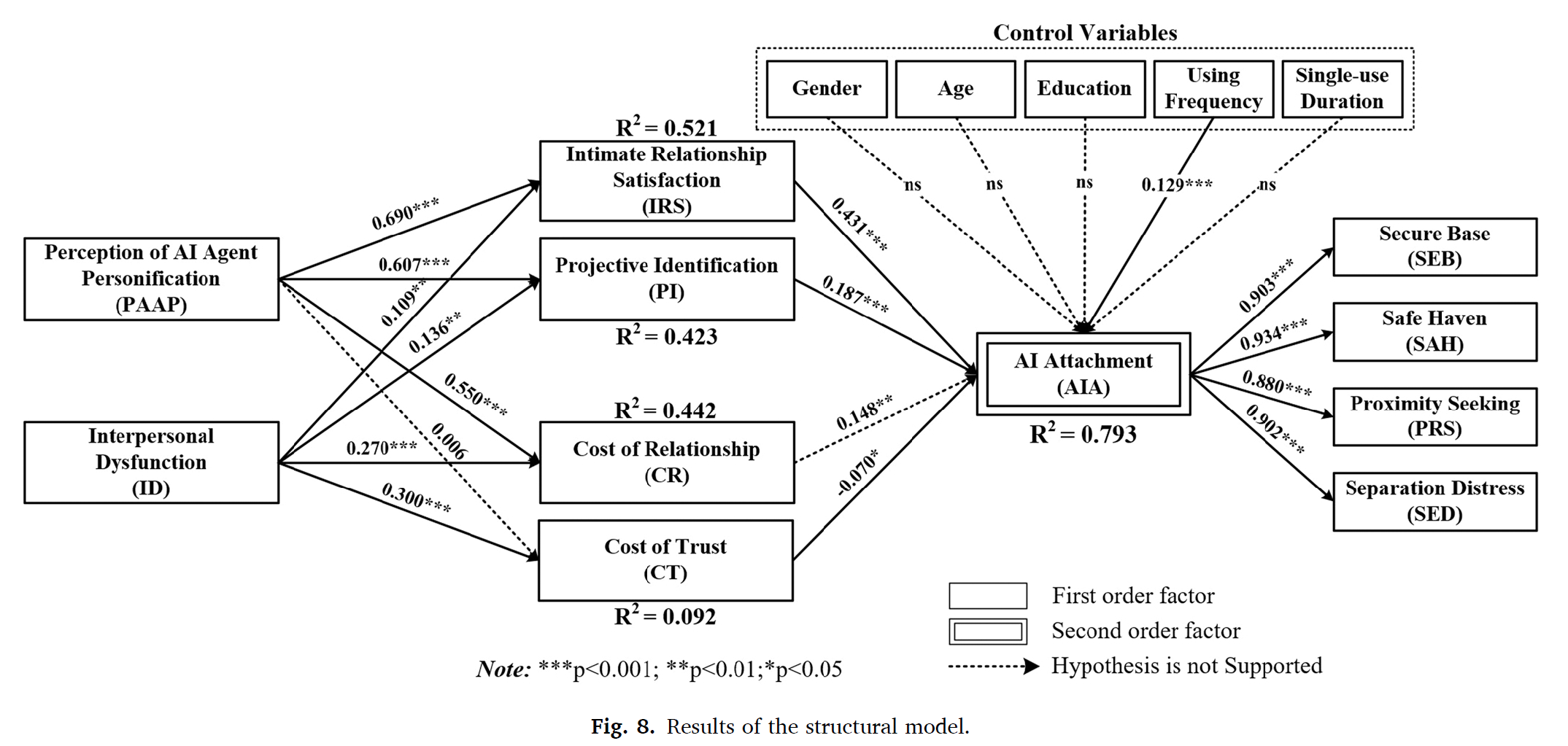 这项研究在以下四个方面做出了贡献:第一,本研究在广泛数据与实证基础上提出了“人际&人机关系态度——价值评估——依恋表现”的AI依恋形成的概念框架并构建了研究模型,同时发现AI依恋作为一个高阶构念,其包含了安全基地、避风港、寻求接近以及分离痛苦四种不同表现;第二,区别以往文献中对于人机亲密关系的驱动因素中过多关注AI的技术可供性对亲密关系形成的作用,而忽视人际关系与人机关系之间的交互关系。本研究通过探索并提出人际关系处境(人际关系失调)与人机关系态度(AI主体人格化感知)对关系的驱动作用,不仅强调了人类在人机交互中的主导作用,也打破了信息管理中AI作为工具的惯性认知;第三,基于社会交换理论,本研究揭示出维持与发展人机亲密互动的过程机制,即成本收益的关系视角;第四,研究通过挖掘人机亲密互动中成本收益的关键要素,丰富了关于人机亲密关系的促进和阻碍因素,也为理解GenAI时代下不确定性与信息之间的关系提供了见解。