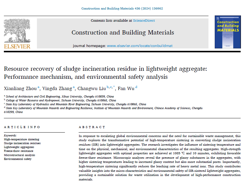 论文《Resource recovery of sludge incineration residue in lightweight aggregate: Performance mechanism, and environmental safety analysis》以2138cn太阳城集团为第一单位,周贤良为第一作者,四川大学刘长武教授为通讯作者。该论文以成都市某污水处理厂中的污泥焚烧残渣为研究对象,探索了高温烧结工艺下污泥焚烧残渣制备轻质骨料的可行性和环境安全性。