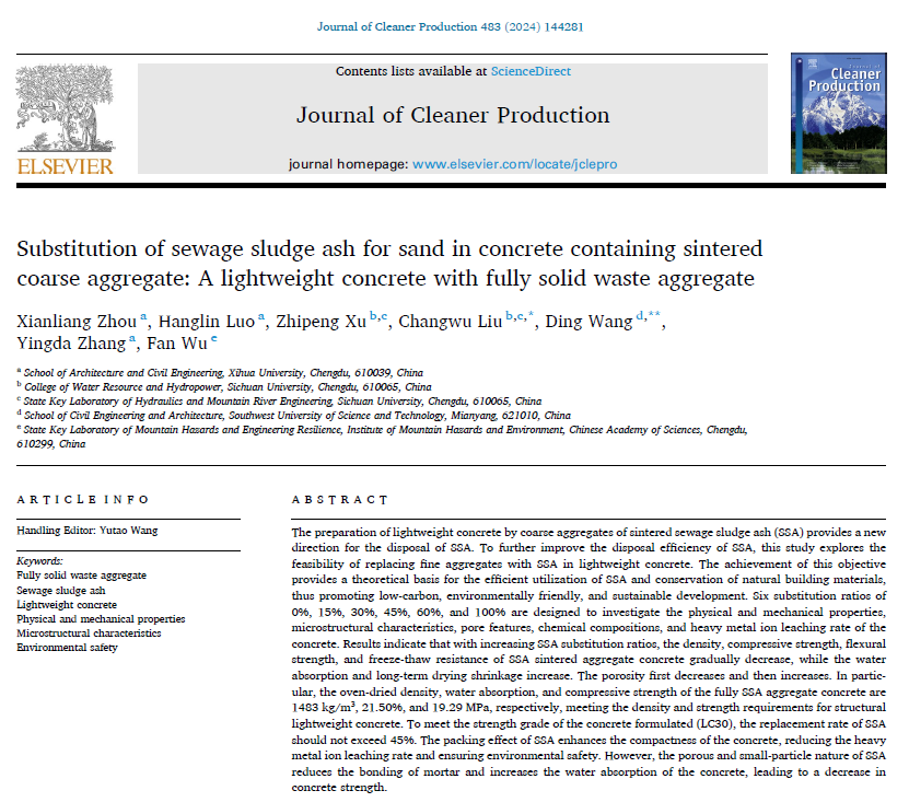 论文《Substitution of sewage sludge ash for sand in concrete containing sintered coarse aggregate: A lightweight concrete with fully solid waste aggregate》以2138cn太阳城集团为第一单位,周贤良为第一作者,2138cn太阳城集团建筑与土木工程学院2021级硕士研究生罗航林为第二作者,四川大学刘长武教授和西南科技大学王丁副教授为共同通讯作者。该论文探索了轻质混凝土中粗细骨料均采用固废的可行性,研究了轻质混凝土的相关性能及固废中重金属离子在混凝土中的固化效果。