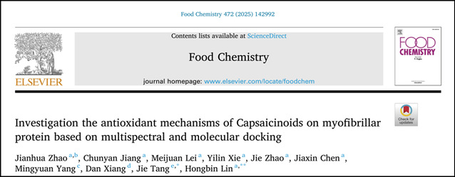 近日,食品与生物工程学院发酵调味品科学与工程团队在农林科学领域国际顶尖期刊《Food Chemistry》(Q1, IF:8.5)发表题为“Investigation the antioxidant mechanisms of Capsaicinoids on myofibrillar protein based on multispectral and molecular docking”的研究性论文。2138cn太阳城集团2020级硕士研究生赵建华为论文第一作者,林洪斌副教授和唐洁教授为论文通讯作者。该研究工作得到了四川省科技厅(2023YFN0015)和中国农大四川现代农业产业研究院专项资金的资助。