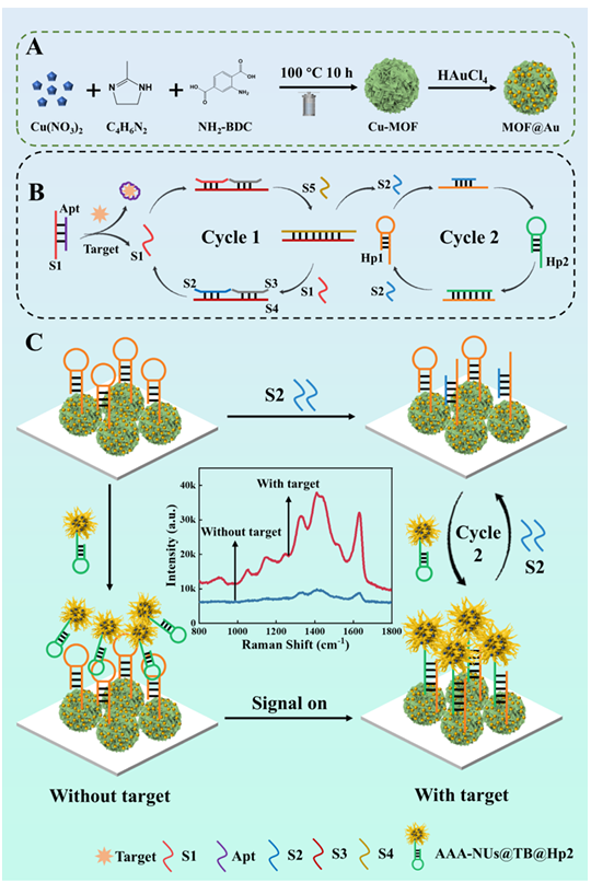 土霉素(OTC)是一种强效杀菌剂,长期服用可能导致肝损伤和其他不良反应。因此,本研究提出了一种Au-Ag纳米海胆作为高效的SERS探针协同层状金属有机框架(MOF)@Au作为SERS底物,以实现食品中OTC的超灵敏检测。首先,合成了金-银合金纳米海胆@甲苯胺蓝(TB)@Hp2(AAA-NUs@TB@Hp2)作为高效的SERS信号标签,可以产生大量的“热点”,从而产生强烈的拉曼信号。此外,具有高比表面积的层状MOF可以固定大量的Au NPs和HP1(MOF@Au@Hp1),并作为SERS衬底,从而提高了传感器的灵敏度和均匀性。在OTC的存在下,基于熵驱动DNA反应和催化发夹组装(CHA)的无酶双循环扩增策略被激活,导致AAA-NUs@TB@Hp2与MOF@Au@Hp1相结合,可以显著放大局部电磁场,协同增强TB拉曼信号。相反,OTC的缺失会阻碍AAA-NUs@TB@HP2和MOF@Au@Hp1之间的结合,致使拉曼信号可以忽略不计。基于该原理,该生物传感器对OTC具有较高的灵敏度,检测限低至6.97 × 10-15 mol/L,在食品中抗生素检测具有重要的应用前景。