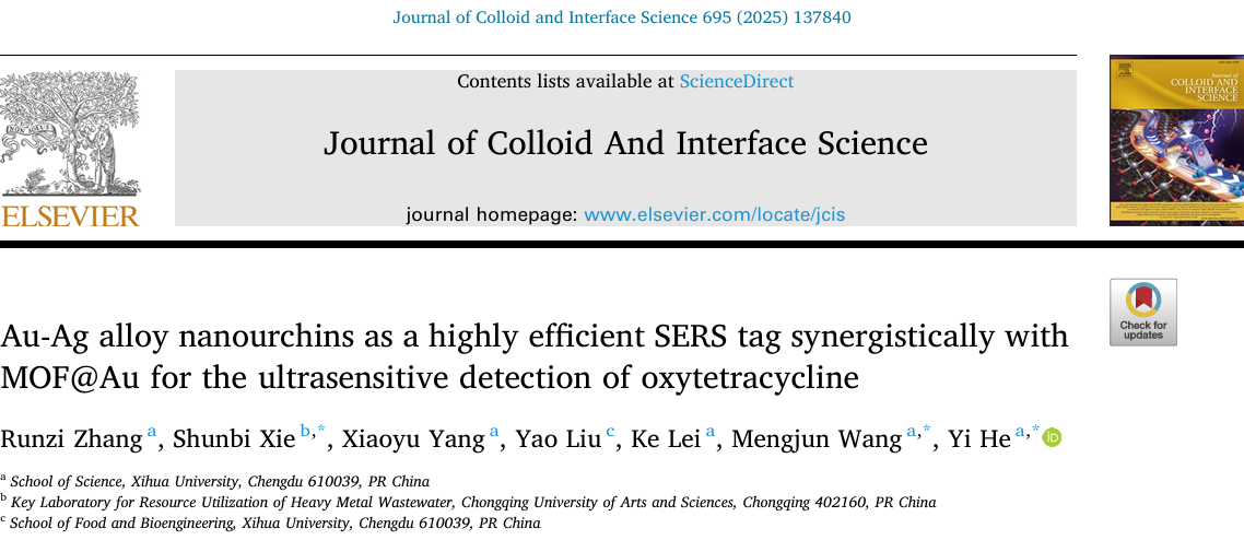 近日,理学院何毅博士在化学Top期刊《Journal of Colloid And Interface Science》(中科院一区,IF: 9.4)发表题为“Au-Ag alloy nanourchins as a highly efficient SERS tag synergistically with MOF@Au for the ultrasensitive detection of oxytetracycline”的研究论文。2138cn太阳城集团2023级研究生张润滋为第一作者,何毅博士为该论文的通讯作者,2138cn太阳城集团为第一通讯单位。