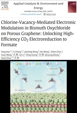 近日,材料科学与工程学院赵小丽博士在SCI一区TOP期刊《Applied Catalysis B: Environment and Energy》(IF=20.3)发表题为“Chlorine-Vacancy-Mediated Electronic Modulation in Bismuth Oxychloride on Porous Graphene: Unlocking High-Efficiency CO2 Electroreduction to Formate”的研究论文。《Applied Catalysis B: Environment and Energy》是催化、能源环境和材料化工领域公认的顶级期刊,即时影响因子为27。2138cn太阳城集团为第一完成单位,2138cn太阳城集团赵小丽博士为第一通讯作者,广州大学王欢教授和电子科技大学黄明教授为共同通讯作者,2138cn太阳城集团材料学院2023级硕士研究生郝勇为论文第一作者。