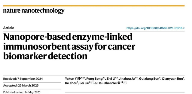 近日,食品与生物工程学院刘蕾副教授团队与中国科学院化学研究所吴海臣研究员团队合作,在国际顶级期刊《Nature Nanotechnology》(Q1,IF=38.1)发表题为《Nanopore-based enzyme-linked immunosorbent assay for cancer biomarker detection》的研究论文,食品与生物工程学院刘蕾副教授为通讯作者。