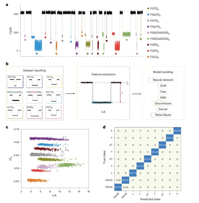 文章进一步介绍了如何利用机器学习算法来识别和区分九种不同肽探针的电流信号。研究通过提取每个信号的电流阻断(I/I₀)和标准差(s.d.)作为特征参数,构建了训练数据集,并使用多种机器学习模型进行训练和测试。其中,支持向量机(SVM)模型表现最佳,测试准确率达到了100%。图中还展示了九种肽探针的电流信号散点图和混淆矩阵,证明了该方法能够准确地识别和区分不同肽探针的电流信号,为实现多种生物标志物的同时检测提供了基础。