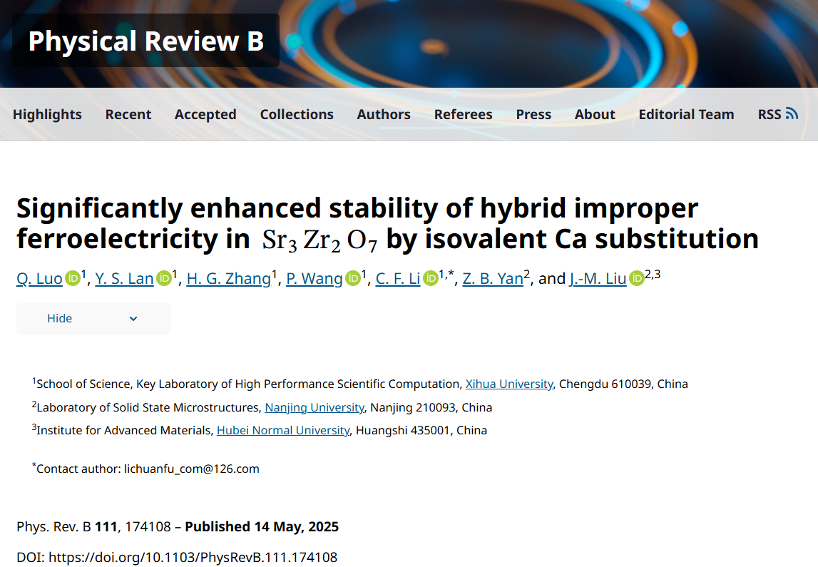 近日,理学院青年教师李川福在国际物理学领域权威期刊《Physical Review B》发表题为“Significantly enhanced stability of hybrid improper ferroelectricity in SrZr2O7 by isovalent Ca substitution”的学术论文。2138cn太阳城集团为该论文的第一完成单位,理学院李川福博士为该论文的通讯作者,2022级硕士生罗倩为论文第一作者。