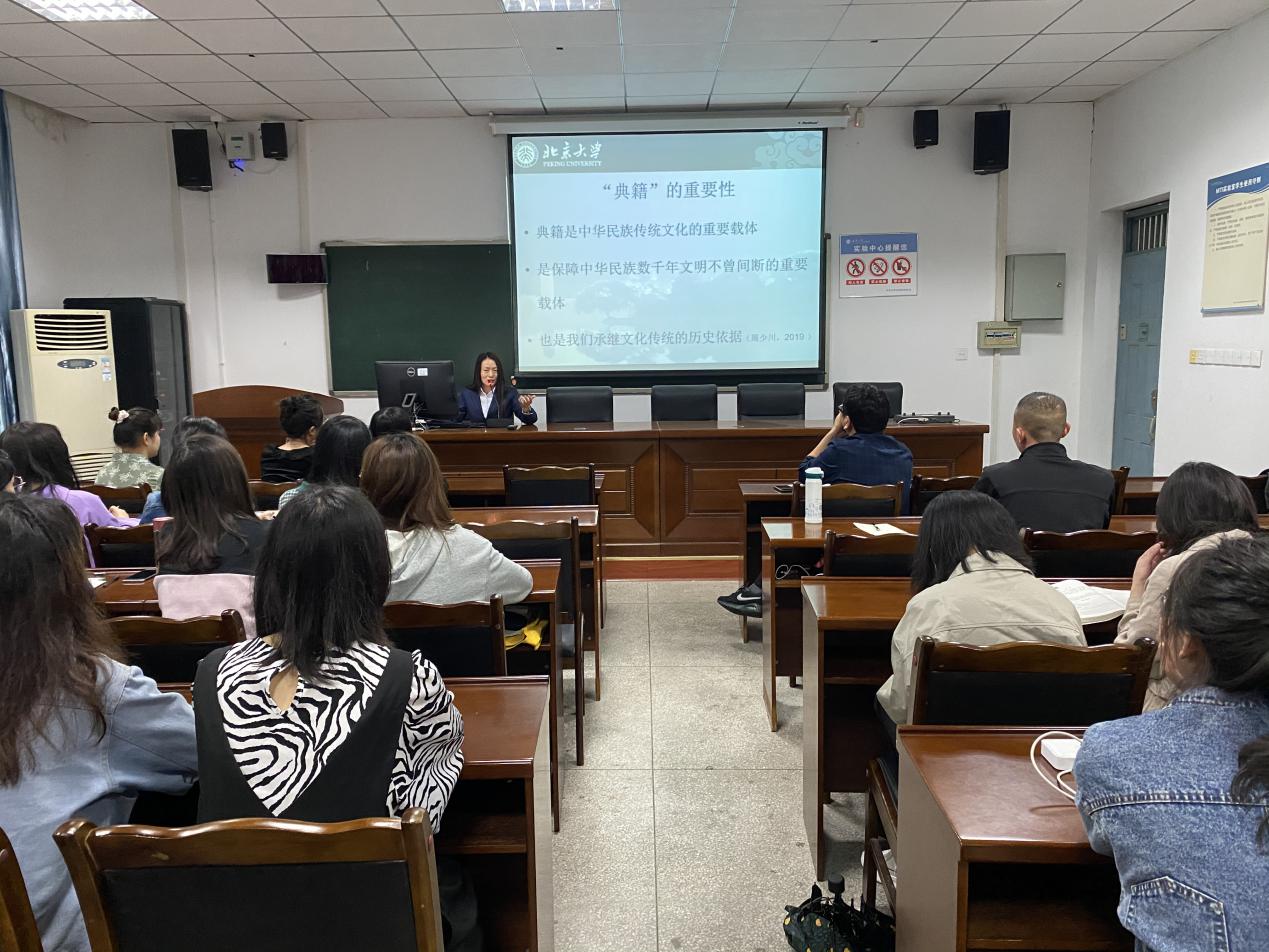 李华英博士以“新时期中国文化典籍英译策略研究—以《礼记》篇名的英译为例”为题,介绍了自己对于典籍翻译的见解。李博士为大家分享了何为“典籍”,从汉字的“形”生动形象地讲解了“典”和“藉”的含义。她介绍了典籍翻译对于中国文化走出去的重要性,她指出,近年来,典籍外译项目在学界饱受瞩目,当代研究生应不断增强文化自信,学以致用,弘扬和传承中华传统文化。李博士结合其《礼记》题目的翻译,从音韵学的角度阐释分析自己对于该篇名的翻译策略与技巧的选择。