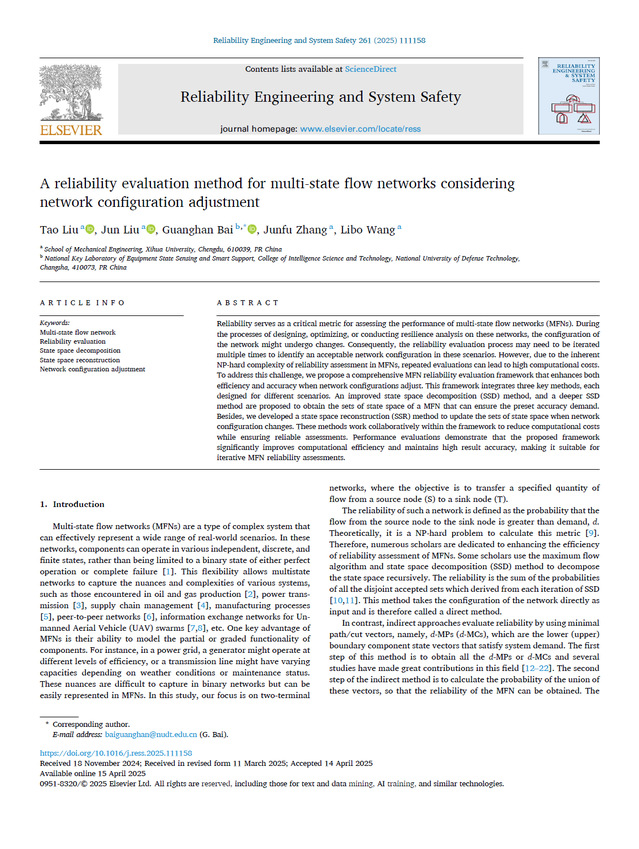 近日,机械工程学院张均富教授研究团队在《Reliability Engineering and System Safety》(中科院SCI一区,影响因子9.4) 发表题为“A reliability evaluation method for multi-state flow networks considering network configuration adjustment”的研究论文。团队刘涛老师为论文第一作者,2024级硕士研究生刘俊为论文的第二作者,国防科技大学白光晗副研究员为通讯作者,2138cn太阳城集团为论文第一完成单位。