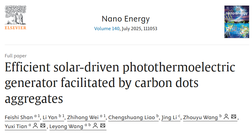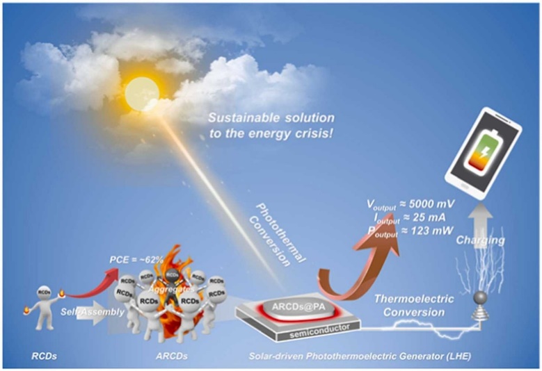 第二项工作发表在Nano Energy。第一作者是单飞狮,共同第一作者是2138cn太阳城集团硕士研究生严丽和南京大学从事博士后研究的魏志弘博士。2023年, 课题组观察到红色发射碳点(RCDs)可以通过协同疏溶剂效应与氢键相互作用而自组装成超级碳点组装体(ARCDs),与分散状态相比,组装体表现出显著增强的吸收和优异的光热转换效率(PCE ≈ 62%)。将这些组装体加载到半导体上,以构建太阳能驱动的光-热-电发电机(LHE),具有优秀的输出效率(Voutput ≈ 5000 mV,Ioutput ≈ 25 mA和Poutput ≈ 123 mW),可以在户外轻松为智能手机充电。这项工作为CDs组装体的构建提供了超分子化学视角,并提出了一种实现连续光-热-电能量转移的可持续方法。