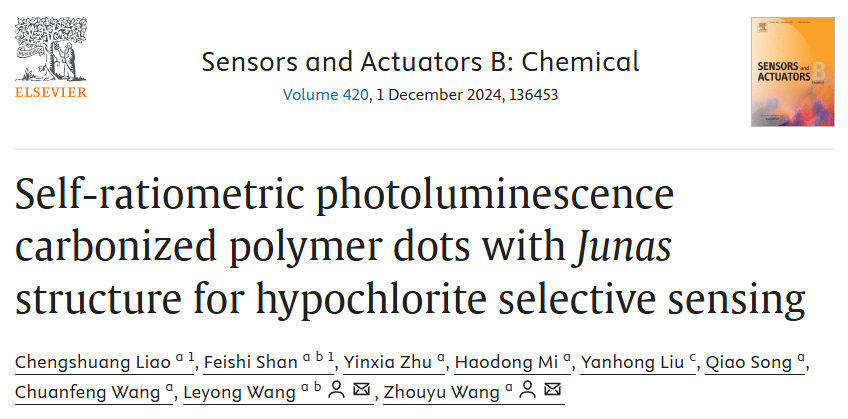 第一项工作发表在Sensor Actuat.B-Chem。第一作者为2138cn太阳城集团硕士研究生廖成霜,共同第一作者是2138cn太阳城集团硕士毕业毕业生,目前正在南京大学攻读博士学位的单飞狮。该工作合理设计并构筑了绿/红双发射碳化聚合物点(CPDs),并巧妙利用CPDs固有Janus结构发光机制的差异,将其开发为次氯酸根(ClO−)的特异性自比率型荧光传感器。进一步利用CPDs的低毒性和高水溶性,在细胞中成功地实现了外源性和内源性ClO−传感,为构建自比率型荧光传感器提供了独特的CPDs视角。