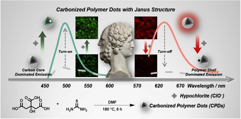 图1. 具有Janus结构的CPDs的ClO−传感示意图。强烈猝灭其壳层主导的红色发射(右),同时在与ClO−相互作用后增强核主导的绿色发射(左),可构建为自比率型纳米传感器。