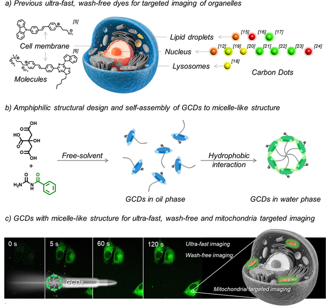 图3.(a)用于细胞器靶向成像的超快、免洗染料;(b)GCDs的两亲性结构设计和自组装成类胶束结构;(c) 具有类胶束结构的GCDs,用于超快、免洗和线粒体靶向成像。