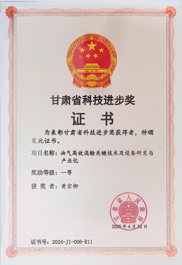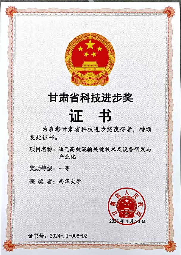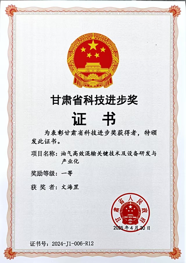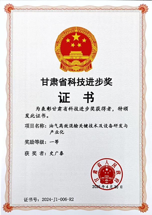 近日,甘肃省人民政府发布《关于2024年度甘肃省科学技术奖励的决定》,199个项目荣获2024年度甘肃省科学技术奖。其中,甘肃省自然科学奖获奖项目26项,技术发明奖获奖项目2项,科学技术进步奖获奖项目171项。我校能源与动力工程学院史广泰教授团队成果《油气高效混输关键技术及设备研发与产业化》获甘肃省科学技术进步奖一等奖,团队成员史广泰教授、黄宗柳副教授、文海罡老师均在此次成果评选中获奖。