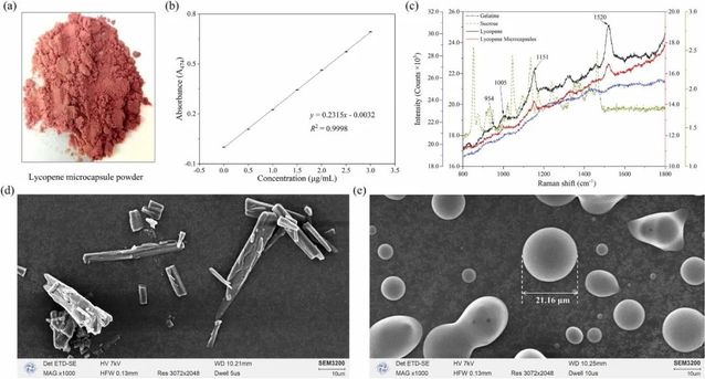 Fig. 1. Lycopene microcapsules powder (a); Quantitative standard curve of lycopene mass concentration (n = 3), error bars represent ± standard deviation (SD) (b); Raman spectra of lycopene before and after microencapsulation (c); Microscopic morphology of lycopene (d) and lycopene microcapsules (e).