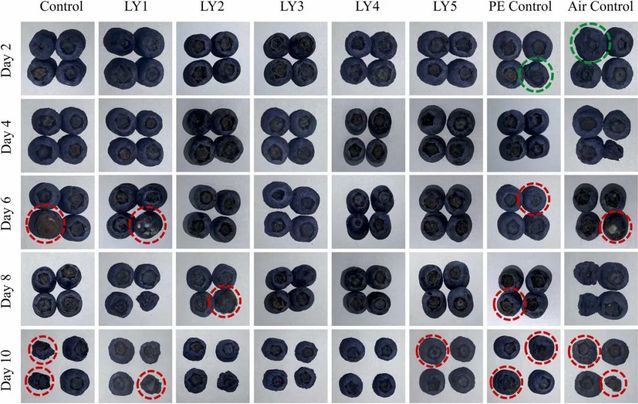 从蓝莓储存的第2天和第6天开始,一些蓝莓表面出现了明显的皱纹和霉菌生长(在图中分别用绿色和红色圆圈标记)。这种皱纹和霉菌生长不是孤立的现象,而是表现出协同效应。蒸腾作用导致蓝莓中的水分以水蒸气的形式通过表皮气孔流失。这个过程导致细胞膨胀压力降低和结构分解,导致皮肤收缩并形成皱纹。皱纹的形成可能会导致果皮和花萼出现微裂缝,露出果肉。霉菌在裸露的果肉上广泛繁殖并消耗水分,进一步加速了水果皱纹的形成。PE对照组表现出更多的霉菌生长。这可能是因为其强大的防潮性能导致呼吸作用产生的水蒸气过度积累,导致环境湿度过高,为真菌繁殖提供了有利条件。此外,过高的CO2和低O2贮藏环境中的浓度可能会触发蓝莓的厌氧呼吸,产生乙醇等有害物质,从而加速果实变质。