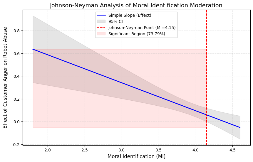 研究三基于412份有效样本,在更大样本规模上检验了整体模型。结果显示,顾客愤怒在机器人服务失败与机器人虐待行为之间发挥显著中介作用(间接效应 = 0.042,95% CI [0.011, 0.076]);机器人拟人化程度显著负向调节机器人服务失败对顾客愤怒的影响(b = −0.15,p < 0.001),道德认同水平显著负向调节顾客愤怒对机器人虐待的影响 (b = −0.17, p < 0.05)。进一步的Johnson–Neyman 分析显示,当道德认同高于4.15时,该关系不再显著。上述结果为研究结论的稳健性与外部效度提供了进一步支持。