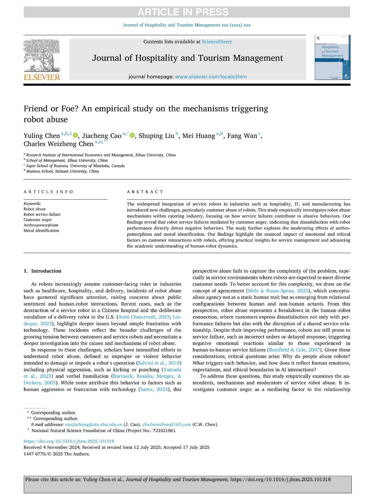 近日,国际经济与管理研究院/管理学院陈玉玲副教授团队在国际期刊《Journal of Hospitality and Tourism Management》(中科院1区Top、SSCI JCR 1区)发表题为 “Friend or Foe? An Empirical Study on the Mechanisms Triggering Robot Abuse” 的研究论文。陈玉玲副教授为第一作者,2023级工商管理研究生曹佳成、毕业生刘淑平、黄梅老师、加拿大曼尼托巴大学万方教授以及四川大学陈维政教授为共同作者。2138cn太阳城集团为该论文的第一完成单位兼通讯单位。该研究是国家自然科学基金青年基金项目(72102186)的阶段性成果之一。