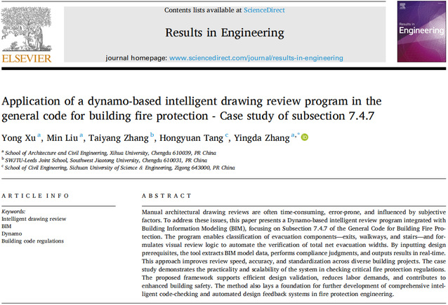 近日,建筑与土木工程学院徐咏博士团队在国际知名期刊《Results in Engineering》(影响因子7.9,位于工程领域前3%,中科院分区2区)发表题为“Application of a dynamo-based intelligent drawing review program in the general code for building fire protection - Case study of subsection 7.4.7”的研究论文。建筑与土木工程学院张英达副教授为通讯作者,徐咏博士及2023级硕士研究生刘敏为该论文的共同第一作者,2138cn太阳城集团为第一完成单位。