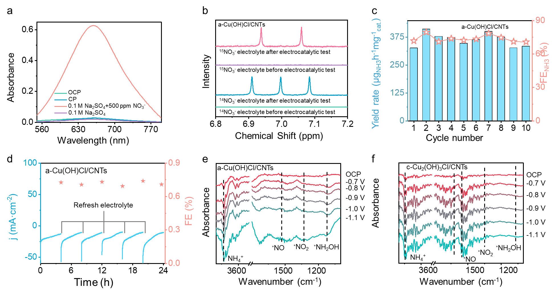 电催化硝酸盐还原反应(NITRR)合成氨是实现硝酸盐水体污染去除和氮循环利用的一种有效途径。目前,电化学NITRR领域的挑战在于设计和开发稳定高效的电催化剂。本文在室温下通过一种简单的螯合共沉淀法在碳纳米管上均匀生长直径约为9 nm的无定形Cu(OH)Cl纳米团簇(a-Cu(OH)Cl/CNTs)用于高选择性电催化NITRR合成氨。值得注意的是,柠檬酸三钠(TCD)可以有效地改变铜纳米团簇的晶体形式,得到a-Cu(OH)Cl纳米团簇,而不是高结晶度的Cu2(OH)3Cl (c-Cu2(OH)3Cl)纳米团簇。与c-Cu2(OH)3Cl纳米团簇相比,a-Cu(OH)Cl纳米团簇具有更小的粒径和更多的表面低配位Cu原子,在电催化NITRR过程中能提供更丰富的有效催化活性位点,从而提高了电催化NITRR合成NH3的选择性和能量效率。本文为后续通过金属纳米团簇的晶体调制策略提高电催化NITRR性能,提供了一定的实验和理论参考。