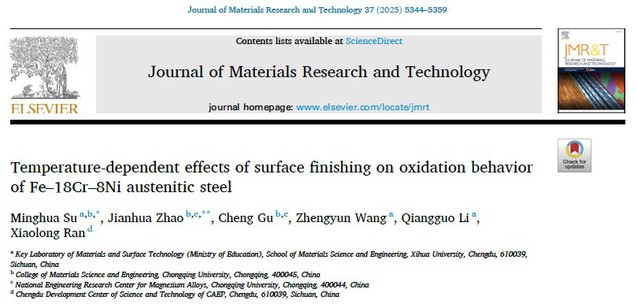 近日,材料科学与工程学院王正云教授团队苏明华博士、李强国副研究员在《Journal of Materials Research and Technology》(IF=6.6)分别发表题为“Temperature-dependent effects of surface finishing on oxidation behavior of Fe-18Cr-8Ni austenitic steel”和“Improving the high stress abrasive wear resistance of medium carbon quenched and partitioned bainitic steel by controlling the phase transformation sequence”的研究论文。2138cn太阳城集团为第一完成单位,王正云教授为共同通讯作者。