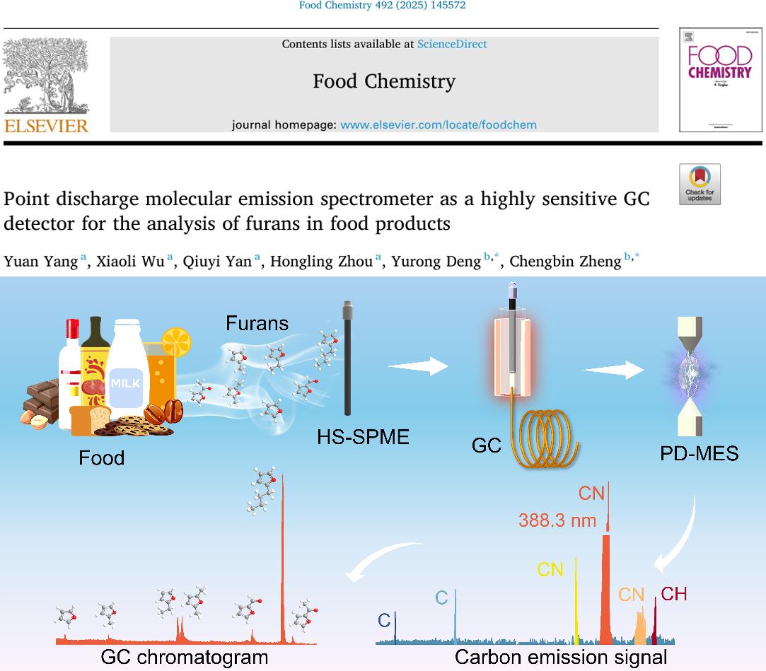 近日,理学院杨媛老师在农林科学领域国际顶尖期刊《Food Chemistry》(IF:9.8)发表题为“Point discharge molecular emission spectrometer as a highly sensitive GC detector for the analysis of furans in food products”的研究论文。在化学一区Top学术期刊《Chinese Chemical Letters》(IF:8.9)发表题为“High-throughput miniaturized purge-and-trap device integrating semiconductor refrigeration storage for on-site extraction and long-term preservation of VOCs in water”的研究论文。在化学一区Top学术期刊《Sensors and Actuators: B. Chemical》(IF:7.7)发表题为“A portable chemical vapor generation purge-and-trap point discharge optical emission spectrometer for field selective analysis of Se(IV) in water”的研究论文。