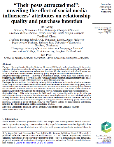 近日,经济学院王博副教授以第一作者身份在国际权威期刊《Journal of Research in Interactive Marketing》(SSCI一区,影响因子11.6)在线发表题为“‘Their posts attracted me!’: Unveiling the effect of social media influencers’attributes on relationship quality and purchase intention”的研究论文。马来西亚思特雅大学Cham Tat Huei教授、澳大利亚科廷大学(新加坡校区)Ian Phau教授为共同作者,2138cn太阳城集团为该论文的第一署名单位。