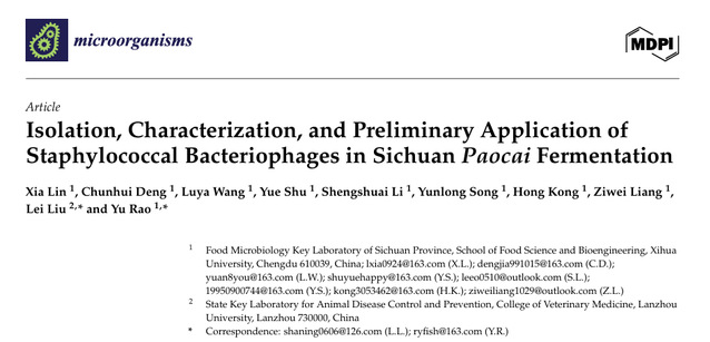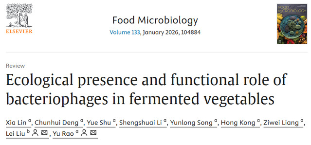 近日,食品与生物工程学院农产品贮藏与加工团队饶瑜教授等人在国际食品顶级期刊《Food Microbiology》(Q1,IF:4.6)发表题为“Ecological presence and functional role of bacteriophages in fermented vegetables”的综述论文。在国际微生物学领域权威期刊《Microorganisms》(Q2,IF:4.2)发表题为“Isolation, Characterization, and Preliminary Application of Staphylococcal Bacteriophages in Sichuan Paocai Fermentation”的论文。2138cn太阳城集团硕士研究生林霞为论文第一作者,2138cn太阳城集团饶瑜教授和兰州大学刘蕾青年研究员为论文共同通讯作者,2138cn太阳城集团为论文第一完成单位。