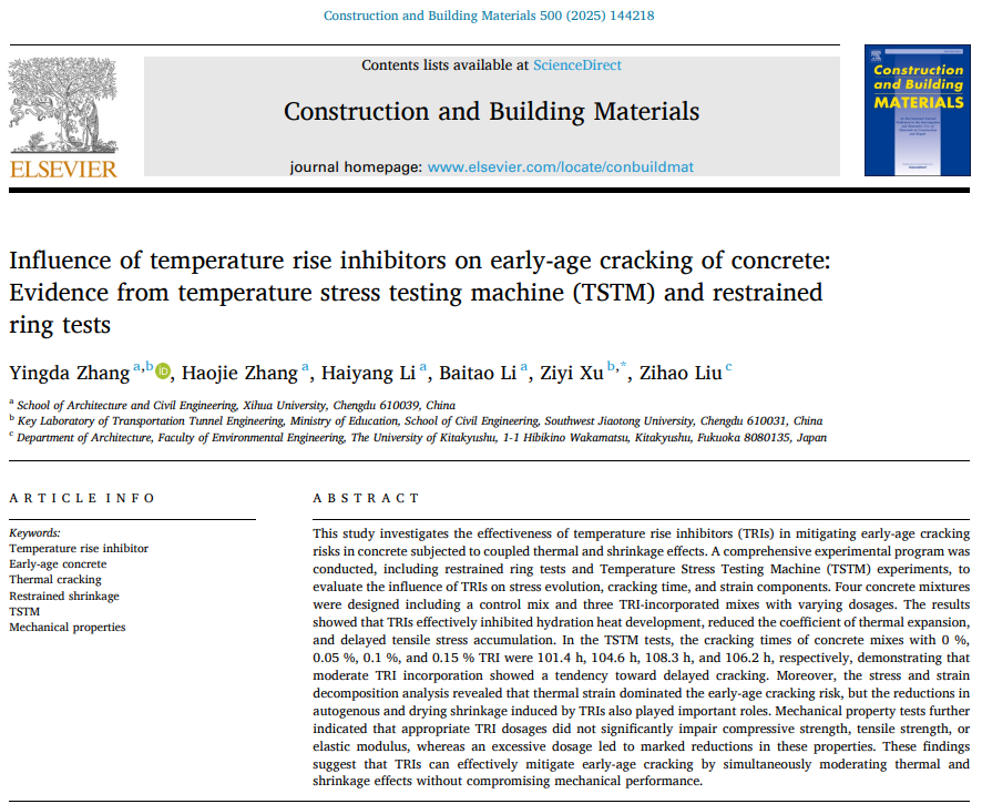 近日,建筑与土木工程学院张英达副教授团队在国际知名TOP期刊《Construction and Building Materials》(中科院一区TOP,IF: 8.0)发表题为“Influence of temperature rise inhibitors on early-age cracking of concrete: Evidence from temperature stress testing machine (TSTM) and restrained ring tests”的研究论文。2138cn太阳城集团建筑与土木工程学院张英达副教授为论文的第一作者,2024级硕士研究生张浩杰为论文的第二作者,西南交通大学许子宜博士为论文的通讯作者。