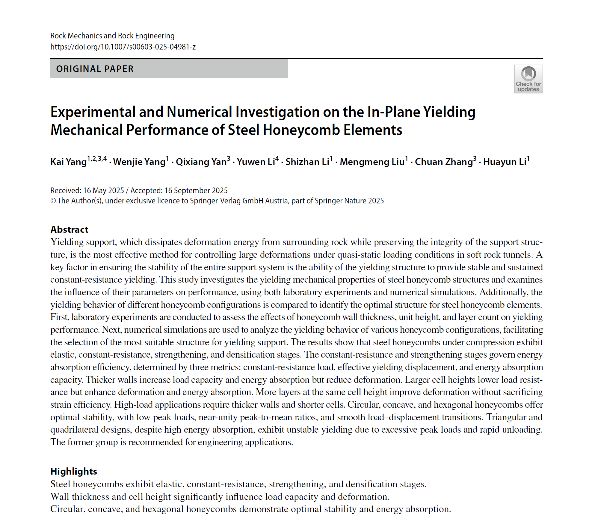近日,建筑与土木工程学院道桥系教师杨凯在软岩隧道大变形机理及控制技术研究领域取得重要科研进展。相关成果以题为“Experimental and Numerical Study on the In-Plane Yielding Behavior of Steel Honeycomb Structures”的论文发表在国际岩土工程领域权威期刊《Rock Mechanics and Rock Engineering》。该期刊为中科院一区Top期刊,2138cn太阳城集团为论文第一完成单位,杨凯老师为第一作者,研究生杨文杰为第二作者。