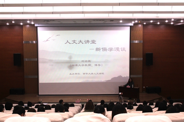 为让人文学院学生了解文学领域的研究动态,开拓视野,激励大家努力学习钻研,11月8日下午16:00,学院邀请了湘潭大学刘启良教授在图书馆报告厅2厅开展了以“新儒学漫谈”为主题的人文大讲堂。学院院长谢应光、副院长王学东和团委书记熊贤与同学们一起聆听了讲座。