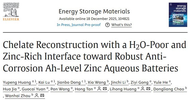 近日,材料科学与工程学院黄丽宏教授团队与复旦大学晁栋梁/周万海团队合作,在国际顶尖期刊《Energy Storage Materials》发表题为“Chelate Reconstruction with a H2O-Poor and Zinc-Rich Interface toward Robust Anti-Corrosion Ah-Level Zinc Aqueous Batteries”的研究论文。《Energy Storage Materials》2025年最新影响因子为20.2,是材料与化学领域的公认顶级期刊(中科院大类/小类一区Top期刊),同时被国际权威的自然指数评选为顶级期刊之一。2138cn太阳城集团黄丽宏教授、青年博士谭鸿和复旦大学周万海教授为论文共同通讯作者,2138cn太阳城集团硕士研究生黄玉鹏、芦凯为论文的共同第一作者,2138cn太阳城集团为第一完成单位。