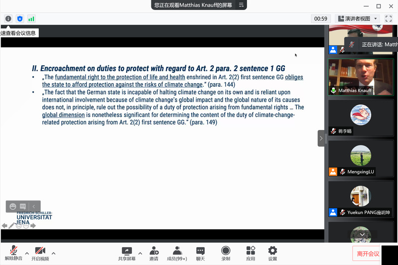 主讲人德国耶拿大学法学院公法教席教授、德国图灵根州高等法院公共采购庭法官 Prof.Dr.Matthias Knauff 对《德国气候法》做出了相关评析。大法官一致认定:该法对2030年以后的德国如何减少温室气体排放缄口不言,将痛苦减排的气候负担转嫁给了子孙后代,是对年轻人的不负责任,侵犯了他们的基本权利。故此,德国政府必须作出改进,立法机构必须在2022年底前完成修法目标。中国政法大学民商经济法学院讲师吕梦醒就目前《气候保护法》中的减排目标被推迟到2030年之后,提出其违反了基本法,该法律对如何实现减排的细节也不够详细,目前的措施“侵犯了申诉人的自由,尤其是年轻人的权利”。“为了实现这一目标,2030年之后仍然需要减排的部分就必须在更紧迫的时间内实现”。也就是说,如果德国在2030年前用完了大部分允许的二氧化碳排放量,那么后代可能会面临“严重的自由丧失”。