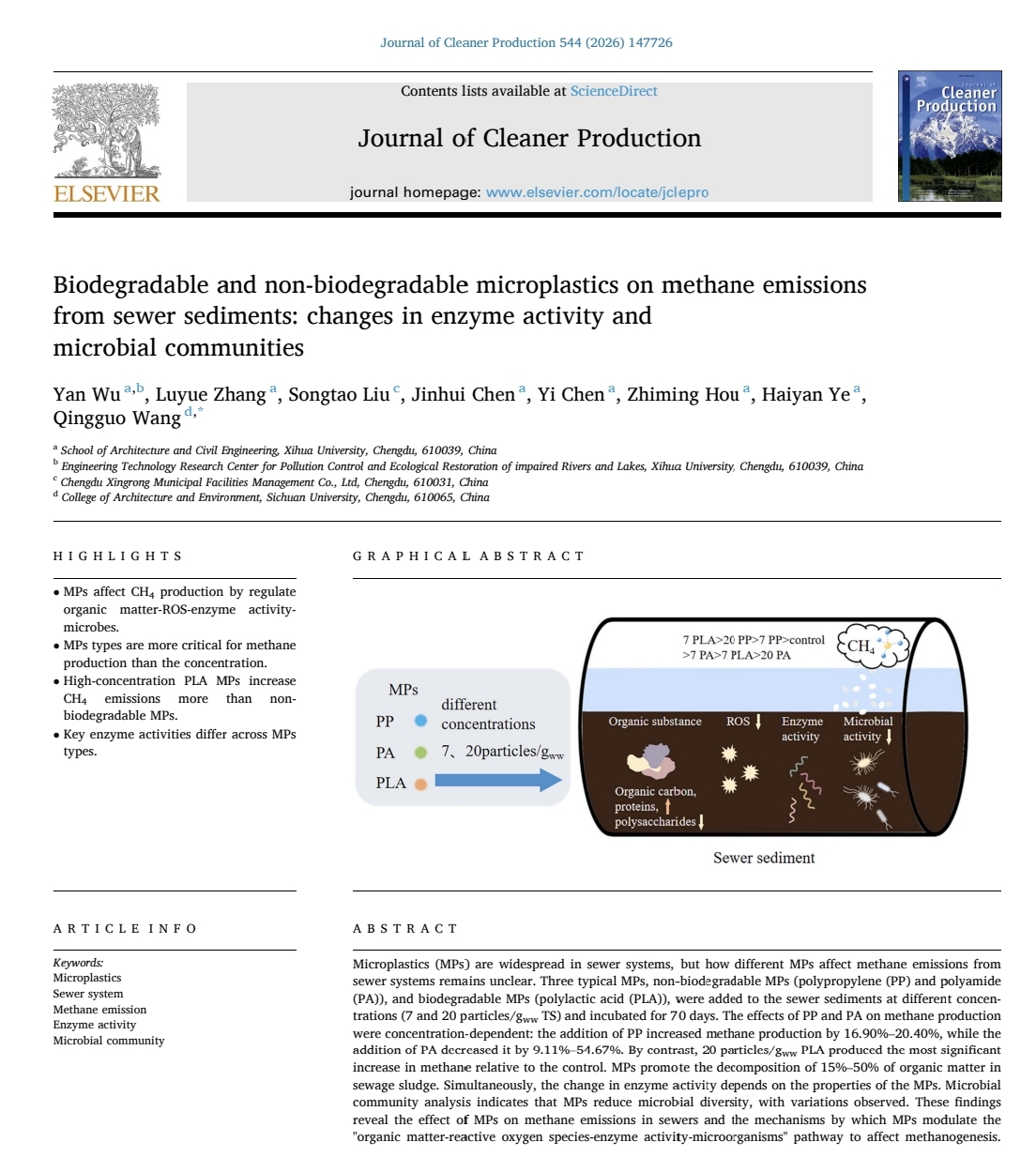近日,建筑与土木工程学院吴燕副教授课题组在国际环境科学与生态学领域Top期刊《Journal of Cleaner Production》(JCR一区、中科院一区Top,IF=10.0)发表题为“Biodegradable and non-biodegradable microplastics on methane emissions from sewer sediments: changes in enzyme activity and microbial communities”的研究论文。2138cn太阳城集团为论文第一单位,建筑与土木工程学院吴燕副教授为第一作者,2023级土木水利研究生张露月为第二作者,四川大学王庆国副教授为通讯作者。成都兴蓉市政设施管理有限公司刘松涛高级工程师参与相关研究。