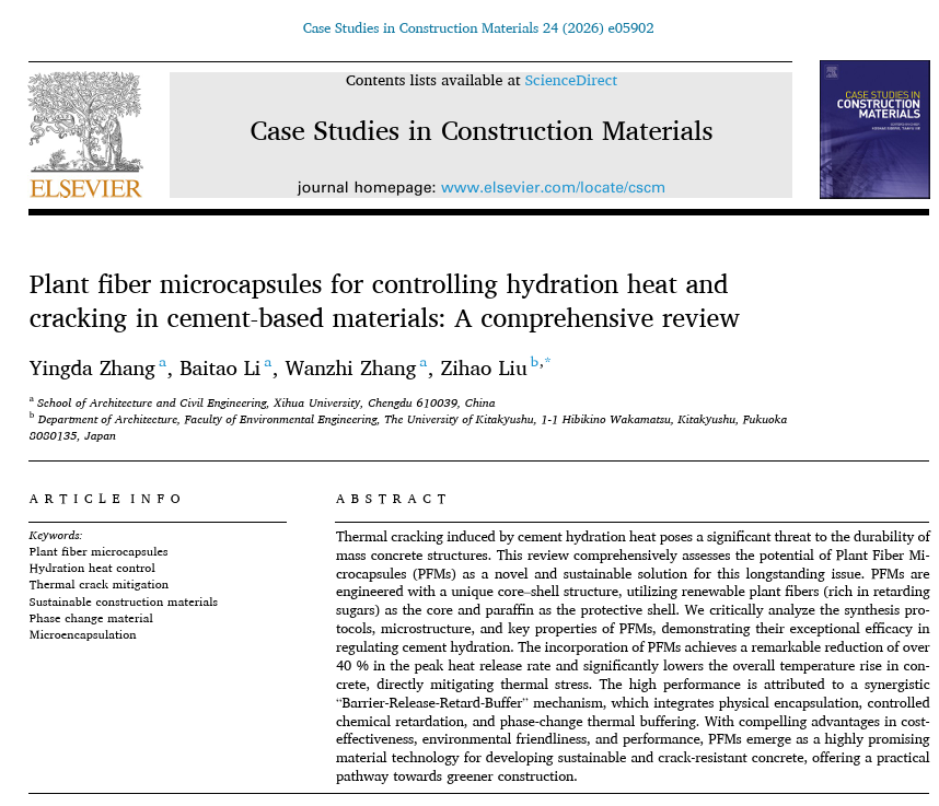 近日,建筑与土木工程学院绿色高性能材料与结构团队在国际著名期刊《Case Studies in Construction Materials》(JCR一区、中科院二区,IF=6.6)发表题为“Plant fiber microcapsules for controlling hydration heat and cracking in cement-based materials: A comprehensive review”的综述研究成果。2138cn太阳城集团为论文第一单位,建筑与土木工程学院张英达副教授为论文第一作者,2025级土木水利研究生李柏涛为第二作者,2138cn太阳城集团张万志老师为第三作者,北九州市立大学刘子浩特聘讲师为通讯作者。