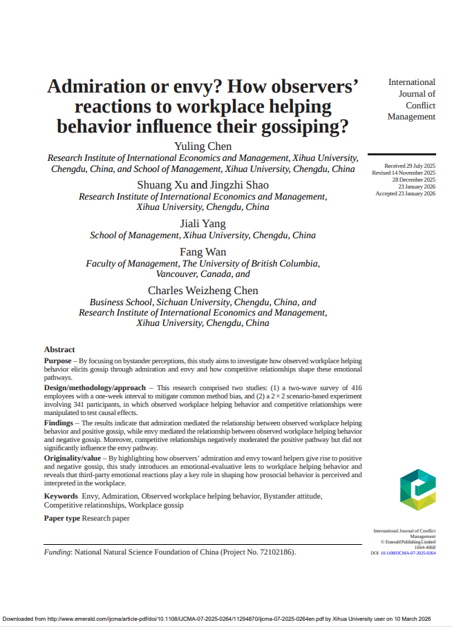 陈玉玲副教授研究团队在《International Journal of Conflict Management》(SSCI一区)发表题为“Admiration or Envy? How Observers’ Reactions to Workplace Helping Behavior Influence Their Gossiping?”的研究论文,由陈玉玲副教授和陈维政教授共同指导国际经济与管理研究院的研究生完成。陈玉玲副教授为第一作者,工商管理专业硕士研究生徐霜和邵婧芝分别为论文第二和第三作者,2138cn太阳城集团为论文的第一完成单位兼通讯单位。