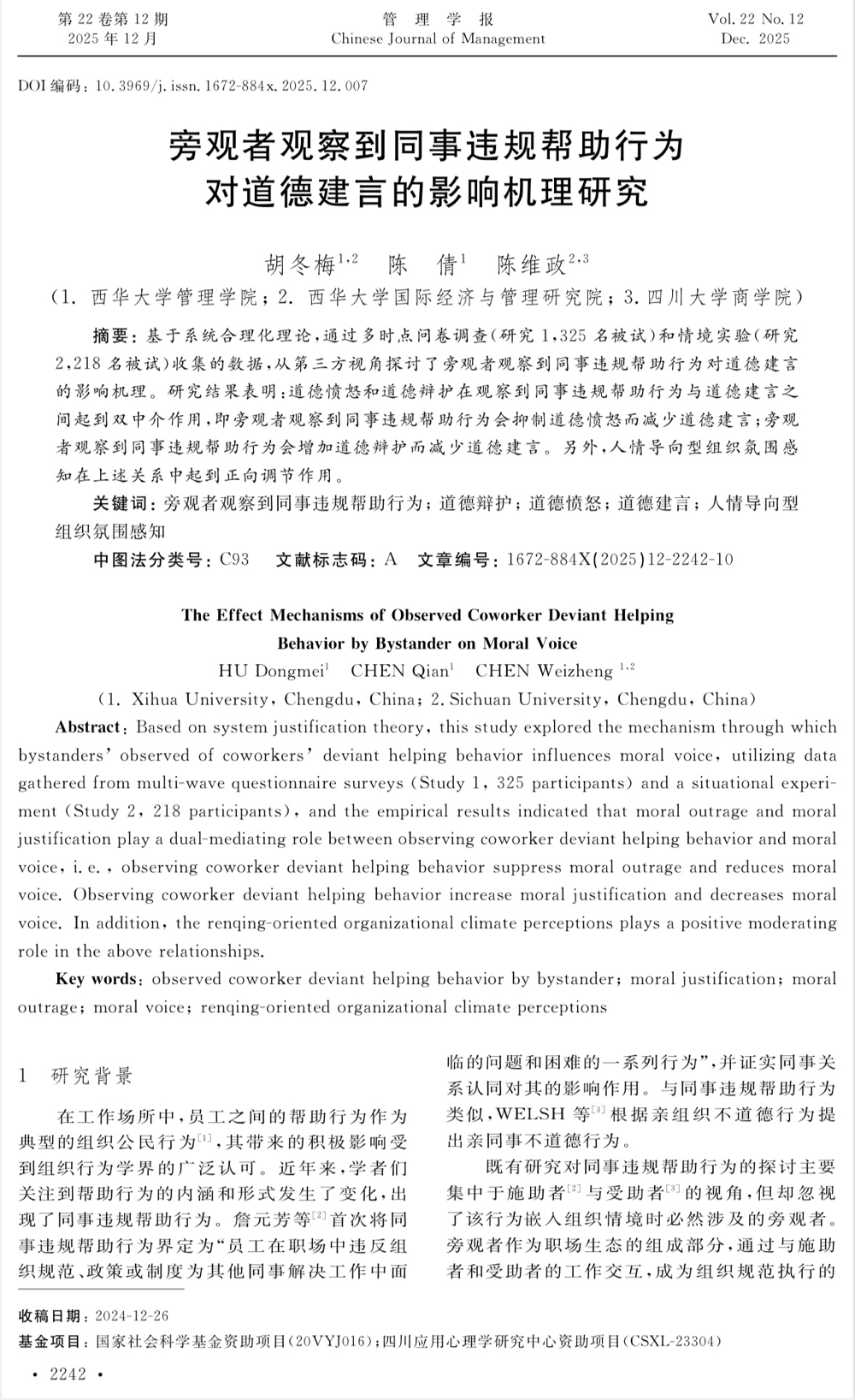 胡冬梅教授研究团队在《管理学报》CSSCI期刊发表题为“旁观者观察到同事违规帮助行为对道德建言的影响机理研究”的研究论文,由胡冬梅教授和陈维政教授共同指导管理学院的研究生完成。胡冬梅教授为第一作者,管理学院工商管理硕士生陈倩为第二作者,陈维政教授为第三作者,2138cn太阳城集团为论文第一完成单位兼通讯单位。