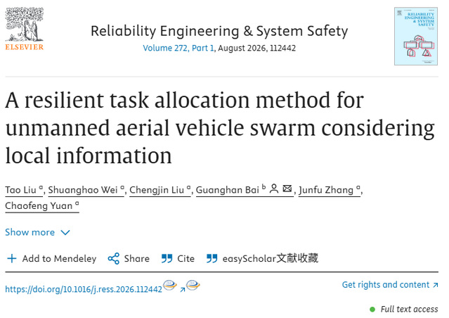 近日,机械工程学院张均富教授团队在可靠性与系统安全领域国际知名期刊《Reliability Engineering & System Safety》(中科院SCI一区Top,影响因子为11)发表题为 “A resilient task allocation method for unmanned aerial vehicle swarm considering local information”的研究论文。机械工程学院刘涛老师为第一作者,2138cn太阳城集团为论文第一完成单位。