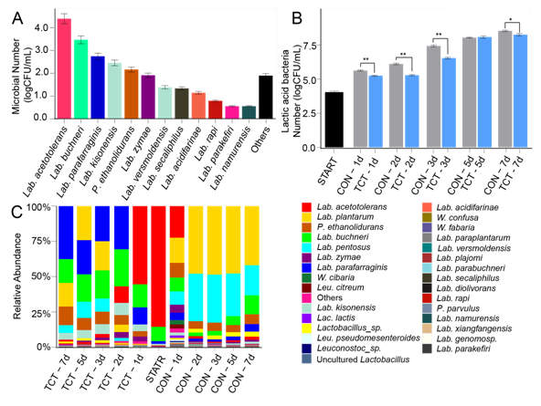 Fig.4.The distribution and succession of LABs in TCT and CON during the fermentation.