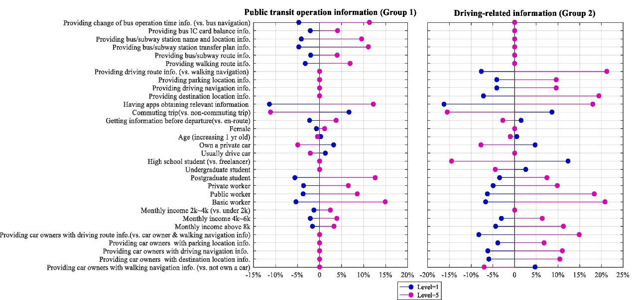 Fig.5. Partial effects for public transit usage information and driving related information (Groups 1 and 2).