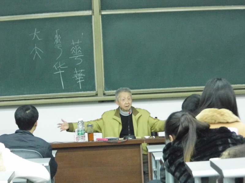 | 11月21日下午,著名学者流沙河先生应人文学院之邀,为我校师带来了一场题为“古今汉字”的精彩讲座。讲座由人文学院院长谢应光主持。 流沙河先生首先以形象的比喻开始讲座,他说,“如果将人类几百万年的历史压缩为一天,那么,语言在清晨出现,文字则在深夜时才产生。”借此说明语言和文字在人类发展历史上的关系。随后,他分析了汉字的优越性,世界上所有的文字在产生之初都是象形文字,但很多国家的文字后来发展成了拼音文字,而汉字却经过了一步步的演变一直保留到了今天。较之于拼音文字,汉字是环保的文字,它能用极少的字符来表示非常丰富的意义;此外,汉字还具有超时空性,各方言区的人们能利用汉字来达到交际的目的。 流沙河先生认为,简化字破坏了汉字原有的意义,因为形象思维是汉字最大的特点,简化后的汉字大大降低了汉字的形象色彩。他以“进”、“西”、“华”、“大”、“学”、“王”、“东”等字为例,引经据典,从甲骨文、繁体字再到简化字,详细讲解了各字的语义及书写形态演变,向同学们展示了先人的智慧,让同学们在生动的例子中了解了看似普通的汉字背后所蕴藏的深刻文化内涵。 尽管流沙河先生已是82岁的高龄,但却依然精神瞿烁,思路清晰,讲座中不时起身对古今汉字进行对比板书。讲座内容丰富,妙趣横生,使在座师生受益匪浅。