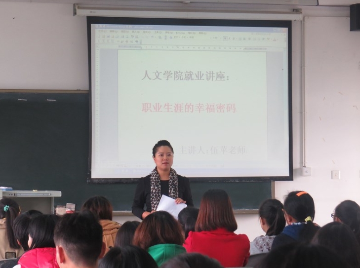 10月21日下午2点,人文学院在6C-513教室举办了题为“职业生涯的幸福密码”的就业讲座。主讲人为苹果树下教育培训学校校长伍苹,学院2010级汉语言文学专业的同学参加了本次讲座。 伍苹老师执教多年、经验丰富,一直秉承着教师应起到行为示范的准则。伍苹老师首先与同学们分享了她在教育工作中遇到的种种问题和从中获得的相关经验。她告诉同学们,教育应释放孩子的天性和潜力,不能限制禁锢他们的发展。针对同学们即将步入社会进入职场的情况,伍苹老师还从人生的选择、阶段性目标的建立、职业中应该具有的素养、如何辨别老板的心思四个方面与同学们分享了心得体会。最后,伍苹老师将“成功,其实并不难;幸福,其实并不远”作为本次讲座的结束语送给同学们,赢得了全场热烈的掌声。 这次讲座,对同学们来说是一次难得的学习经历,对同学们步入社会、进入职场大有裨益。