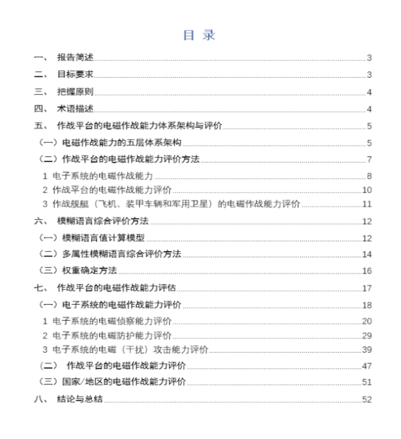 本研究成果针对外军电子战飞机和驱逐舰作战平台的电磁作战能力评估问题,首次基于模糊语言多属性综合评价方法,建立作战平台的电磁作战能力体系架构与评价模型,对部分国家和地区典型作战平台的电磁侦察能力、电磁防护能力和电磁干扰攻击能力进行量化评估,给出作战平台电磁作战能力强、中或弱的综合评价和排序结果,可供国内相关单位分析评估电磁空间安全威胁,以及预测外军电磁作战能力发展趋势提供参考。