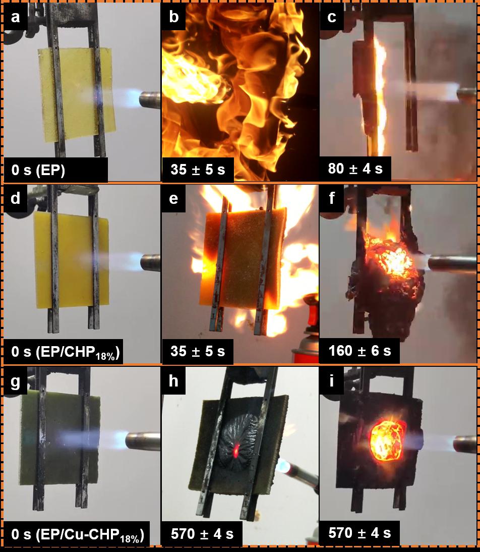 未阻燃EP (a-c),新制CHP阻燃EP (d-f)和新制Cu-CHP阻燃EP (g-i)在丁烷火焰(约1400 °C)喷烧下的代表性图片