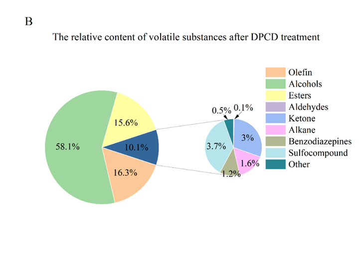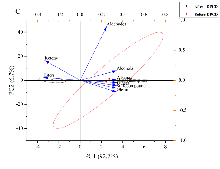 Fig. 3. Changes of volatile flavor components of new-paocai before and after DPCD treatment (25 MPa, 40 °C, 40 min). (A) The relative contents of compound species before DPCD treatment. (B) The relative contents of compound species after DPCD treatment. (C) Principal component analysis based on the GC-MS data set of new-paocai with (or without) the DPCD treatment.